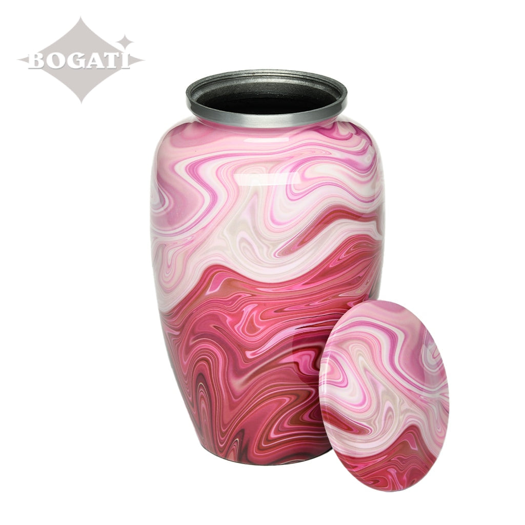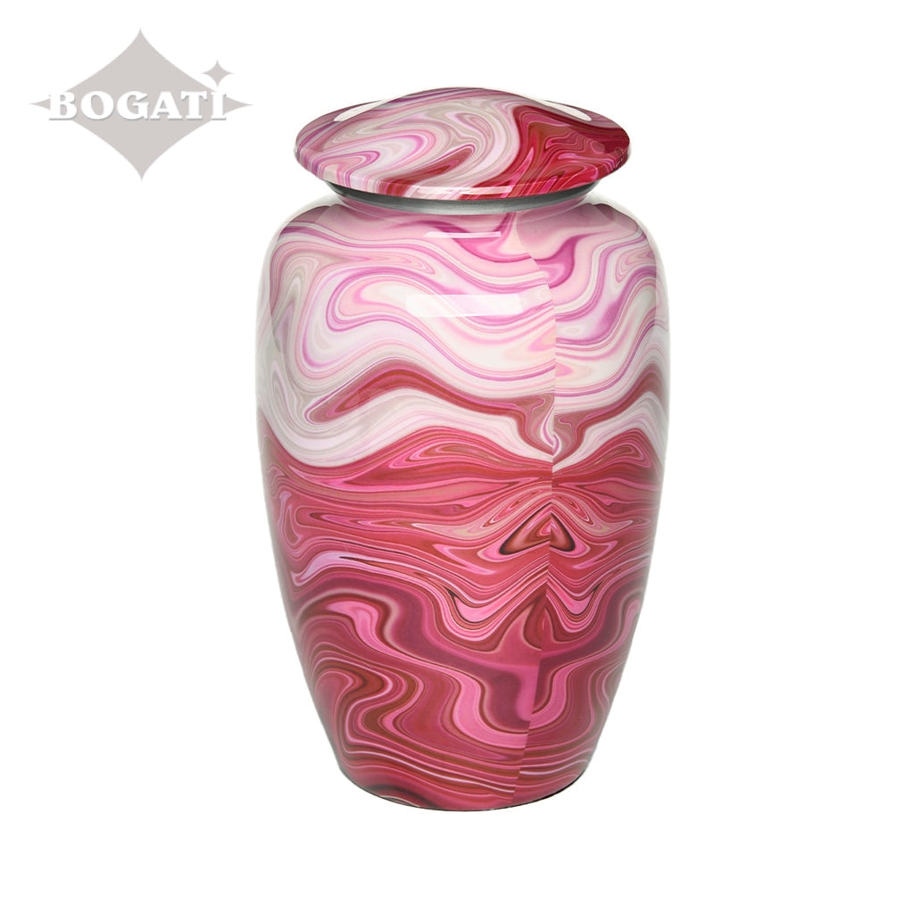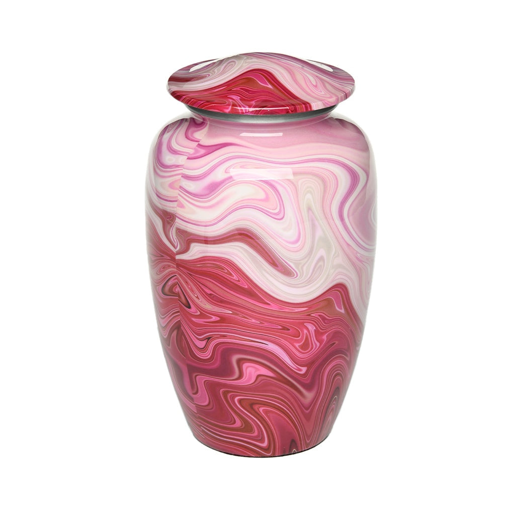 Shades of red and pink form cloud-like formations on our Adult Swirl Alloy Urn. Hand lacquering gives the urn an almost liquid appearance. The sleek classic shape is another hallmark of this urn. The threaded lid offers a secure closure.