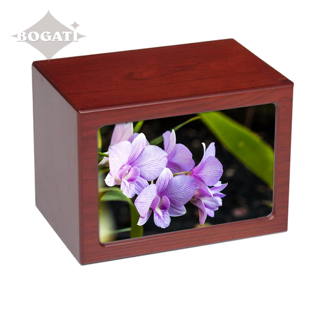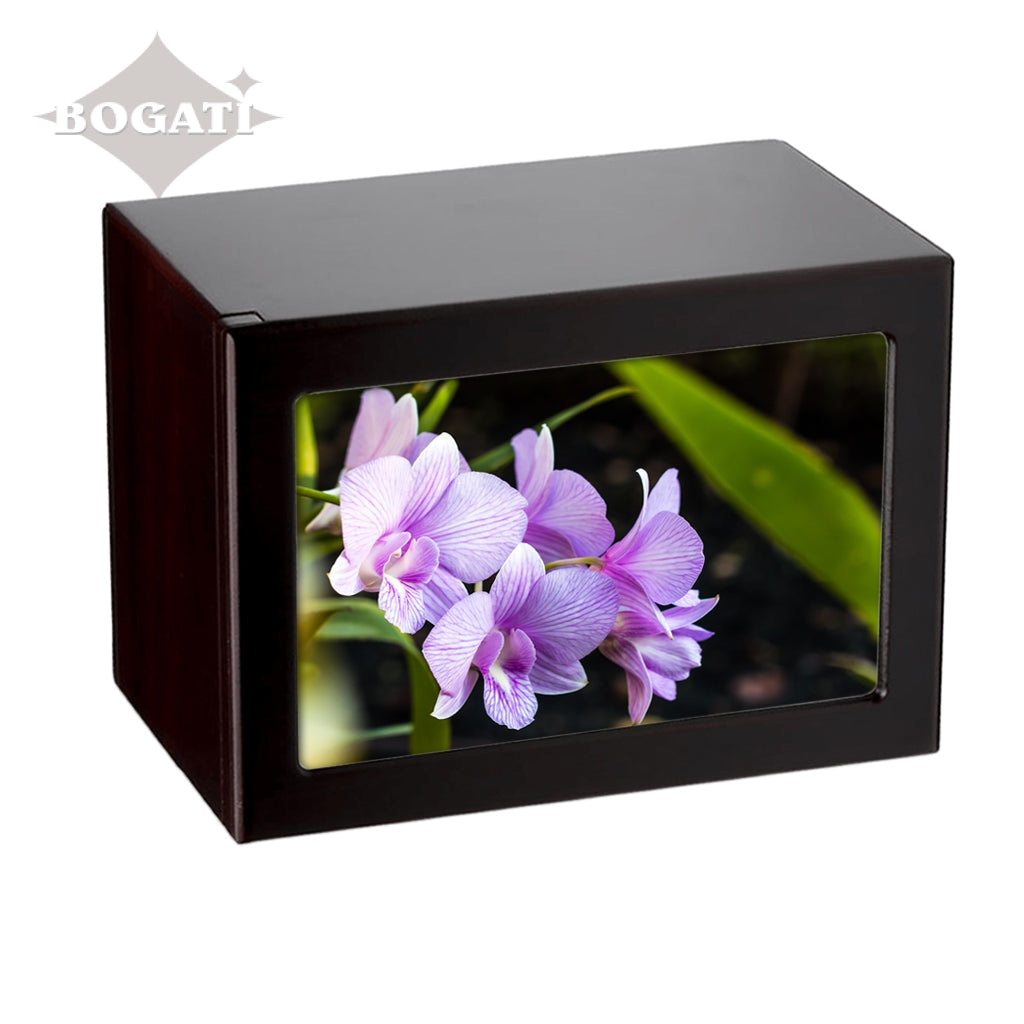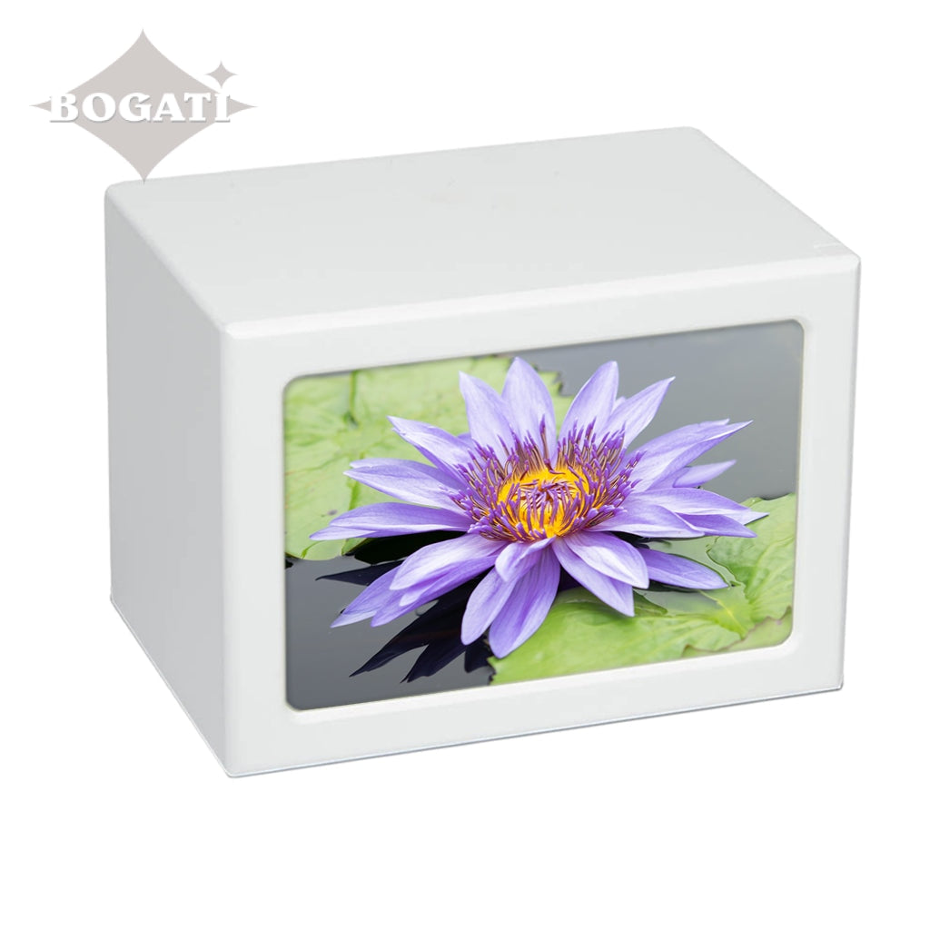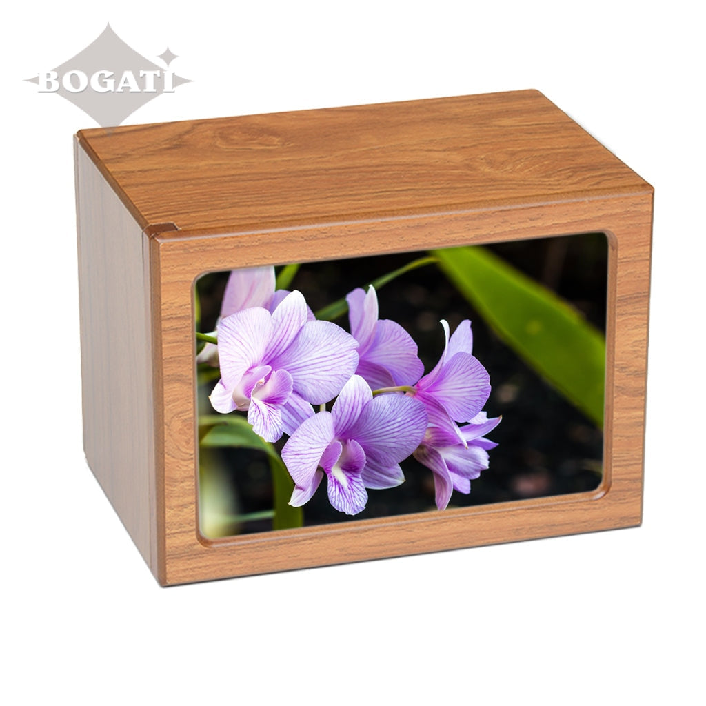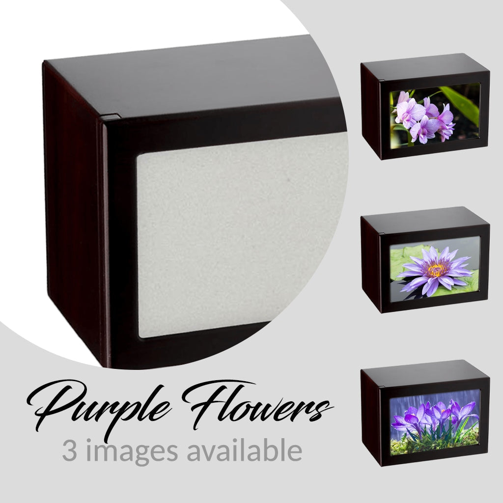 Soft purple tones enhance the pictures featured in this photo-frame urn in four different tones. You can choose from 3 unique pictures of Purple Flowers: Orchids, Crocuses or Water Lily.