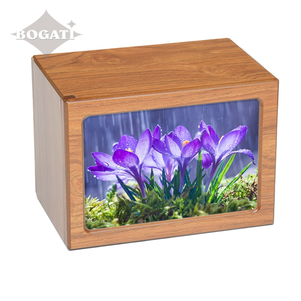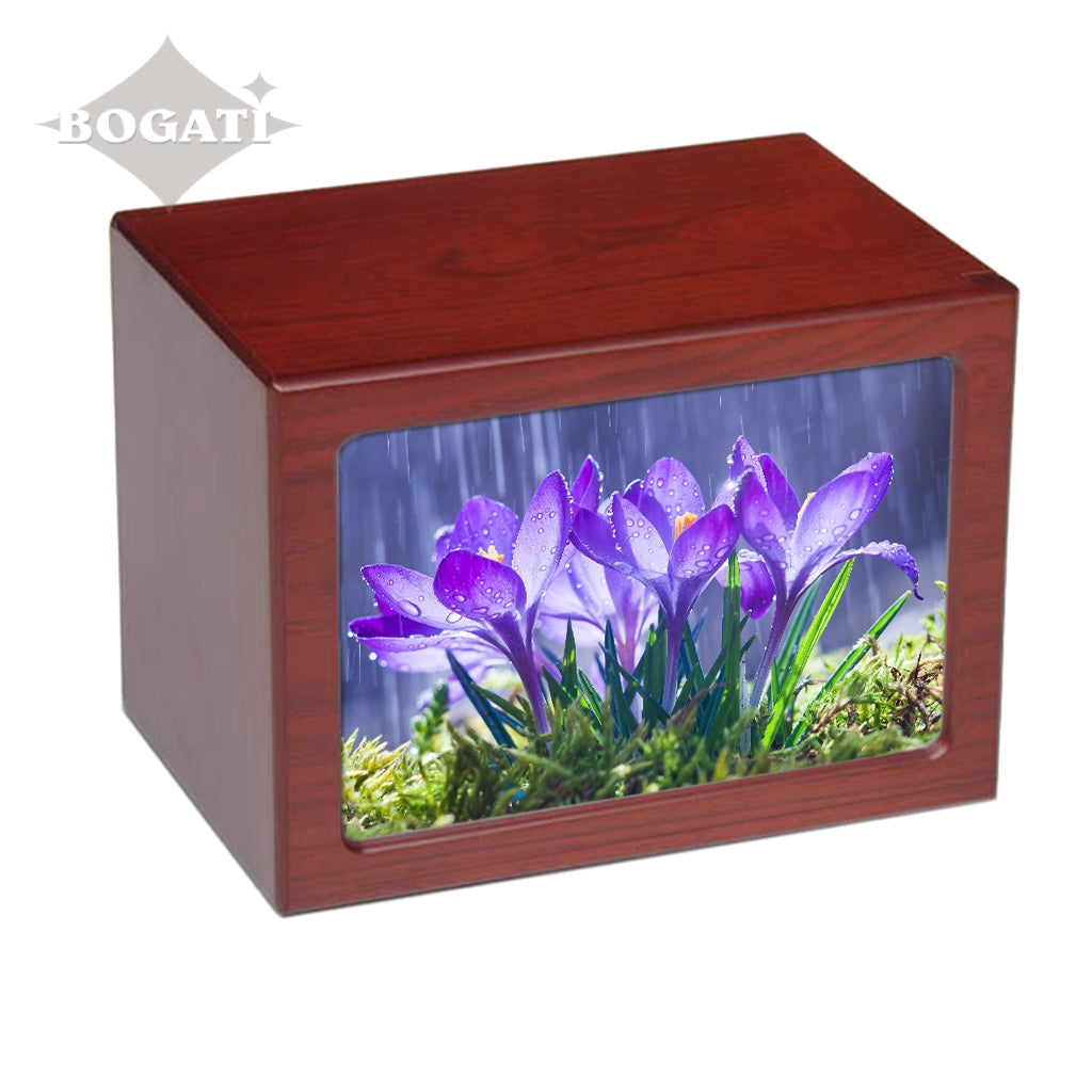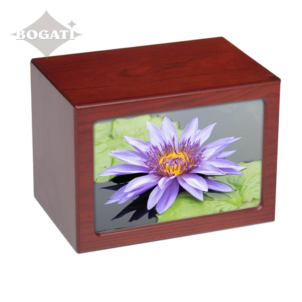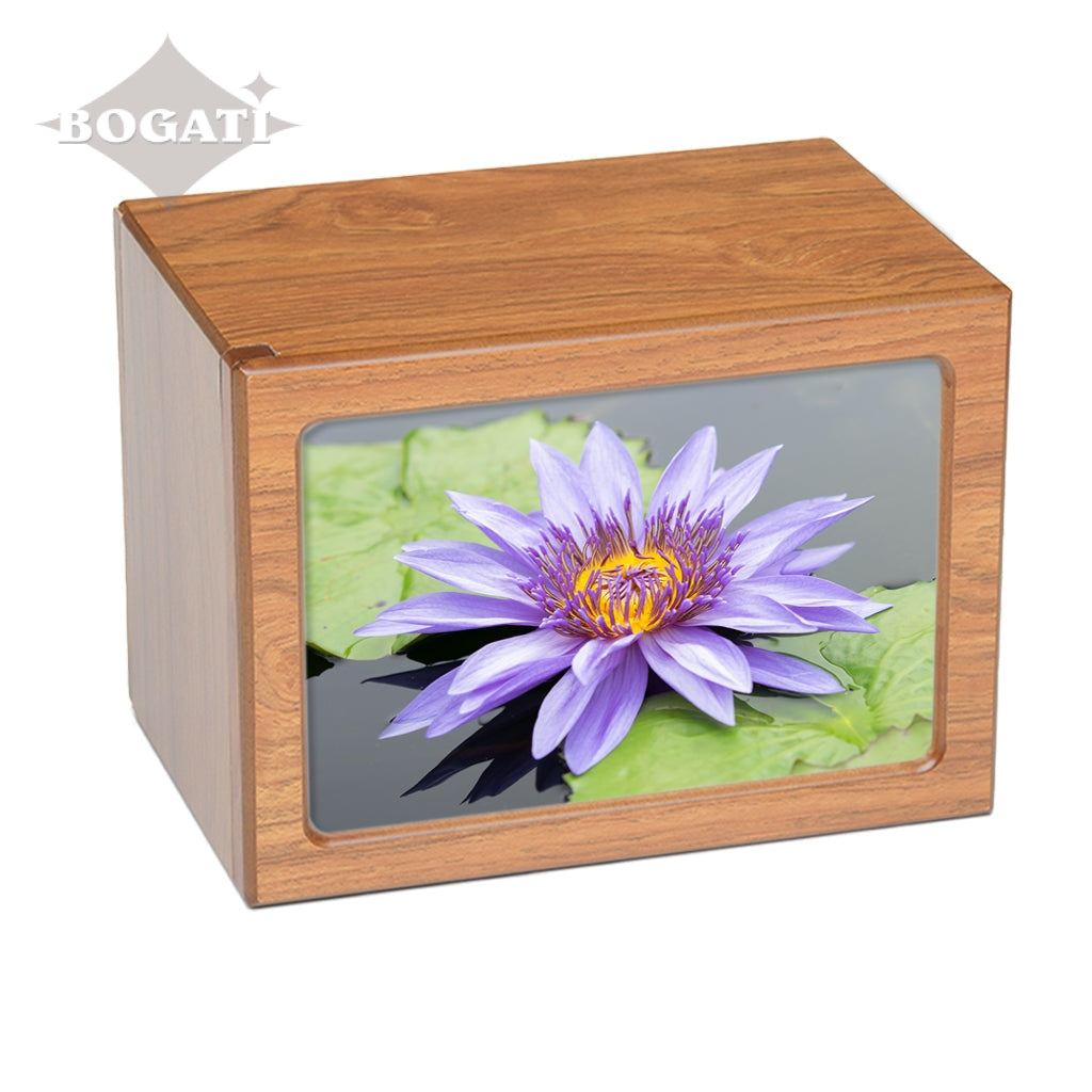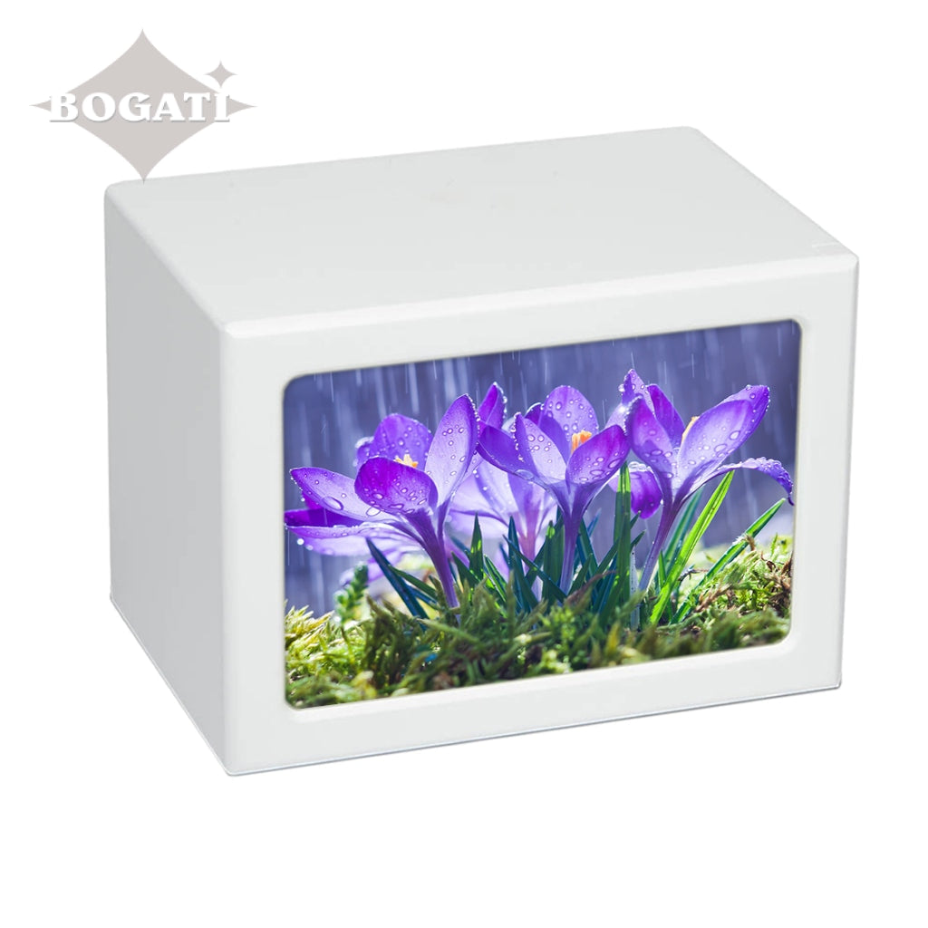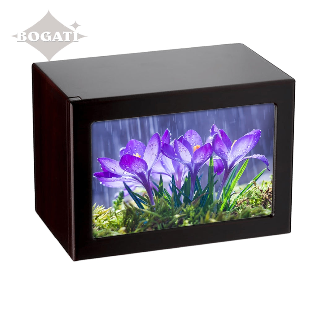 Soft purple tones enhance the pictures featured in this photo-frame urn in four different tones. You can choose from 3 unique pictures of Purple Flowers: Orchids, Crocuses or Water Lily.