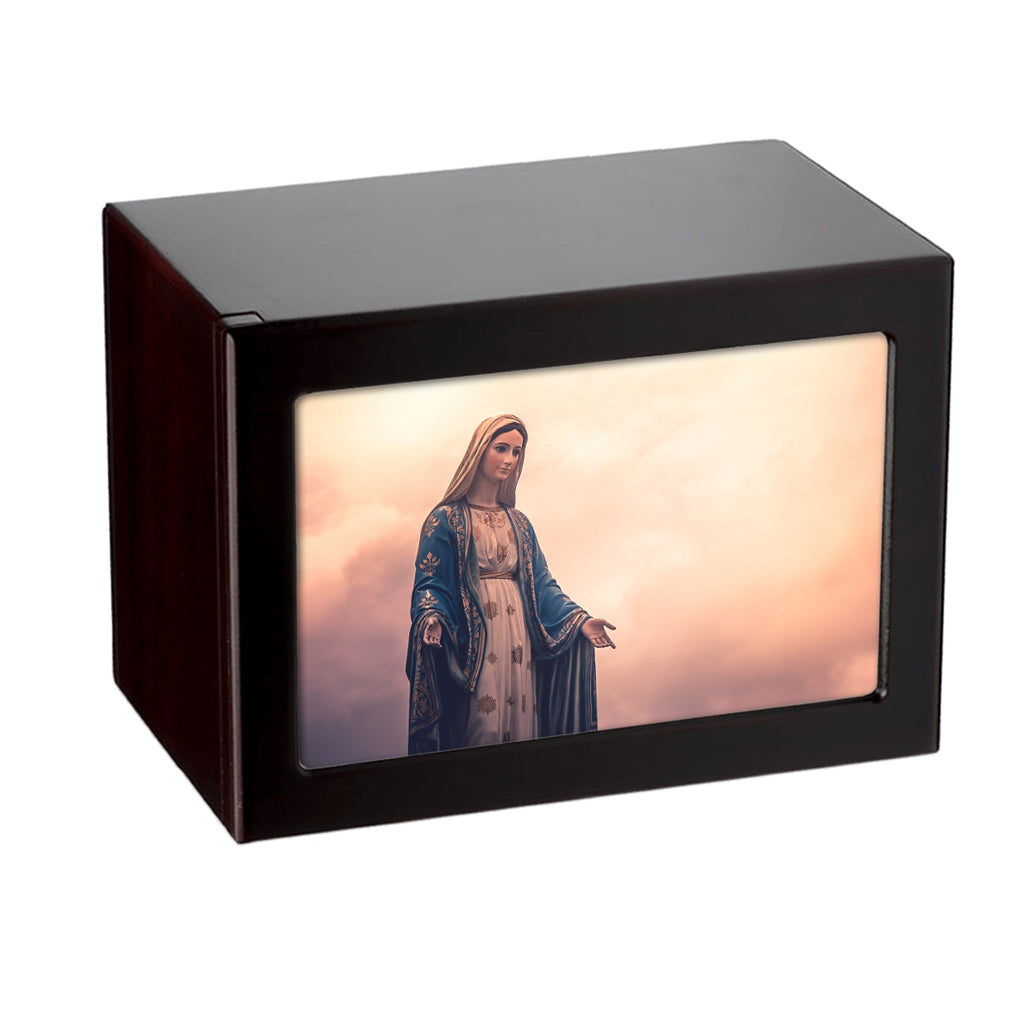 A statue of Mary glows against the sky at sunrise in this moody photograph. The photo sits in an MDF urn with a glass front. The urn is available in white.